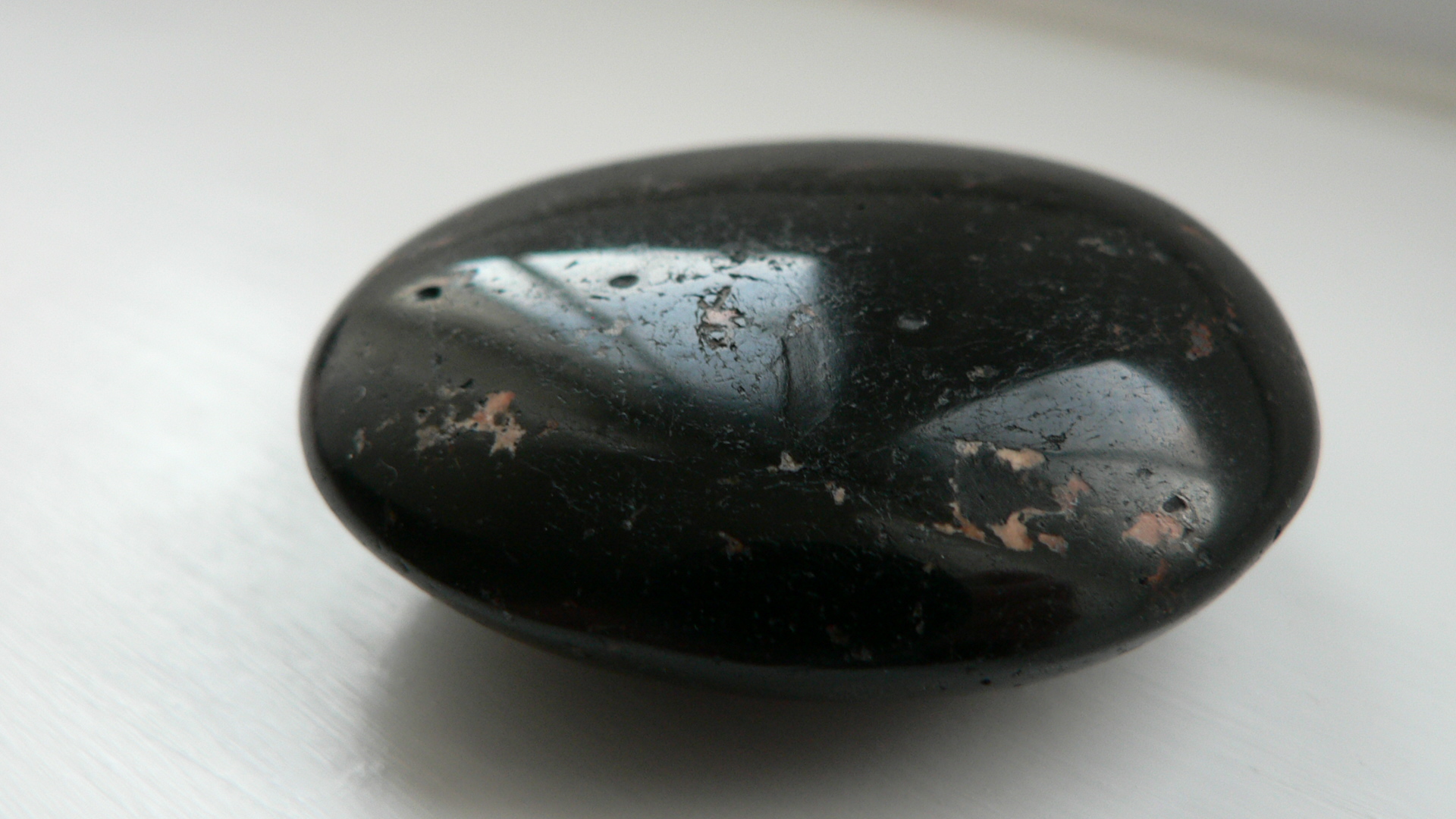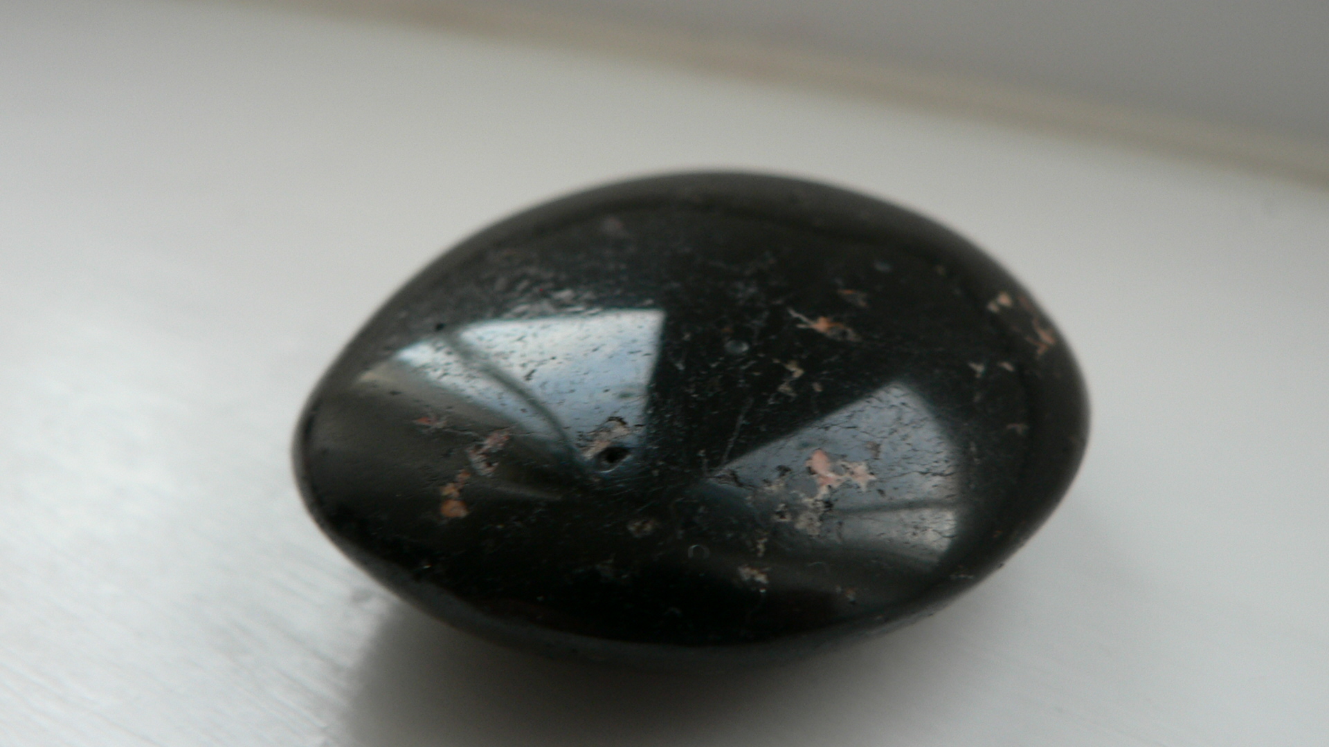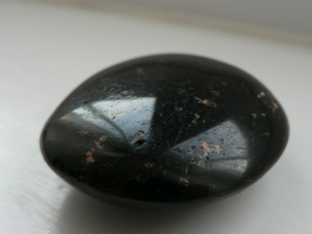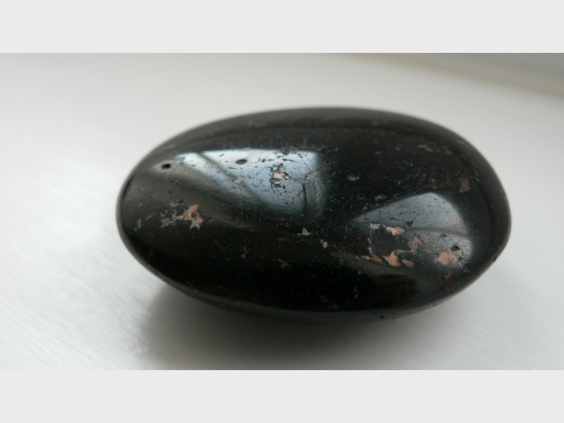 Dieser Jumbostein aus schwarzem, glänzendem Turmalin besitzt rundherum rosaroten Muskovitglimmer. Eine sehr schöne Qualität aus Madagaskar, die auch eine starke Energie ausstrahlt. Durch seine schöne Form ein toller Handschmeichler, mit seiner Tiefe von bis zu 1,7 cm geht er auch noch in die geräumige Hosentasche. Der ca. 4,5 auf 4 cm große Turmalin wiegt ca. 50 Gramm. Sie erhalten genau das abgebildete und beschriebene Unikat im Schmuckbeutel.