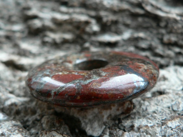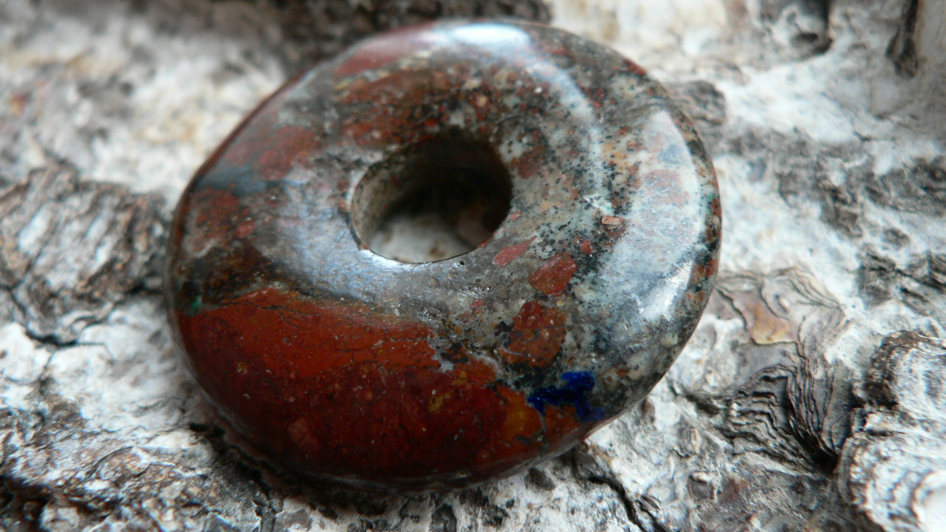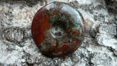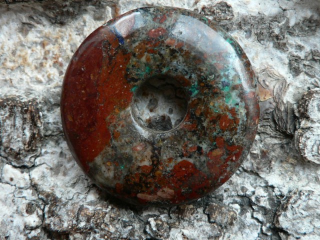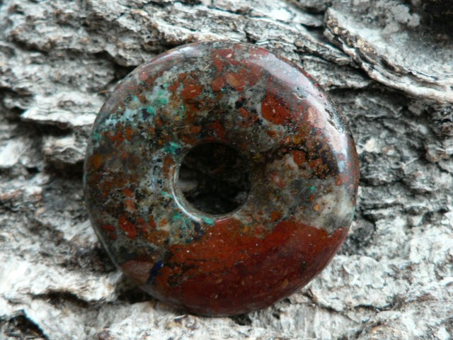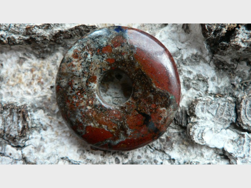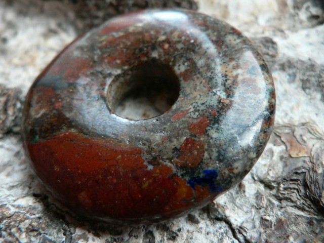 Dieser Donut ist etwas ganz besonderes.....er besteht aus Zarinit. Dieses Mineral gehört zu den Neufunden, da es erst 2015 in Russland (Oblast Kemerovo) entdeckt wurde. Es besteht hauptsächlich aus Cuprit (Kupfer) sowie Azurit, Chrysokoll und Malachit. Es wird mühevoll in derben Massen abgebaut. Eine Rarität, die eine wunderschöne Farbenwelt zeigt. Der gezeigte Donut ist ca. 35mm groß und besitzt die Farbe rot (Cuprit), blau (Azurit) sowie auch grüne Chrysokolleinflüsse. Wir liefern dieses Kleinod mit Lederband im Schmuckbeutel.