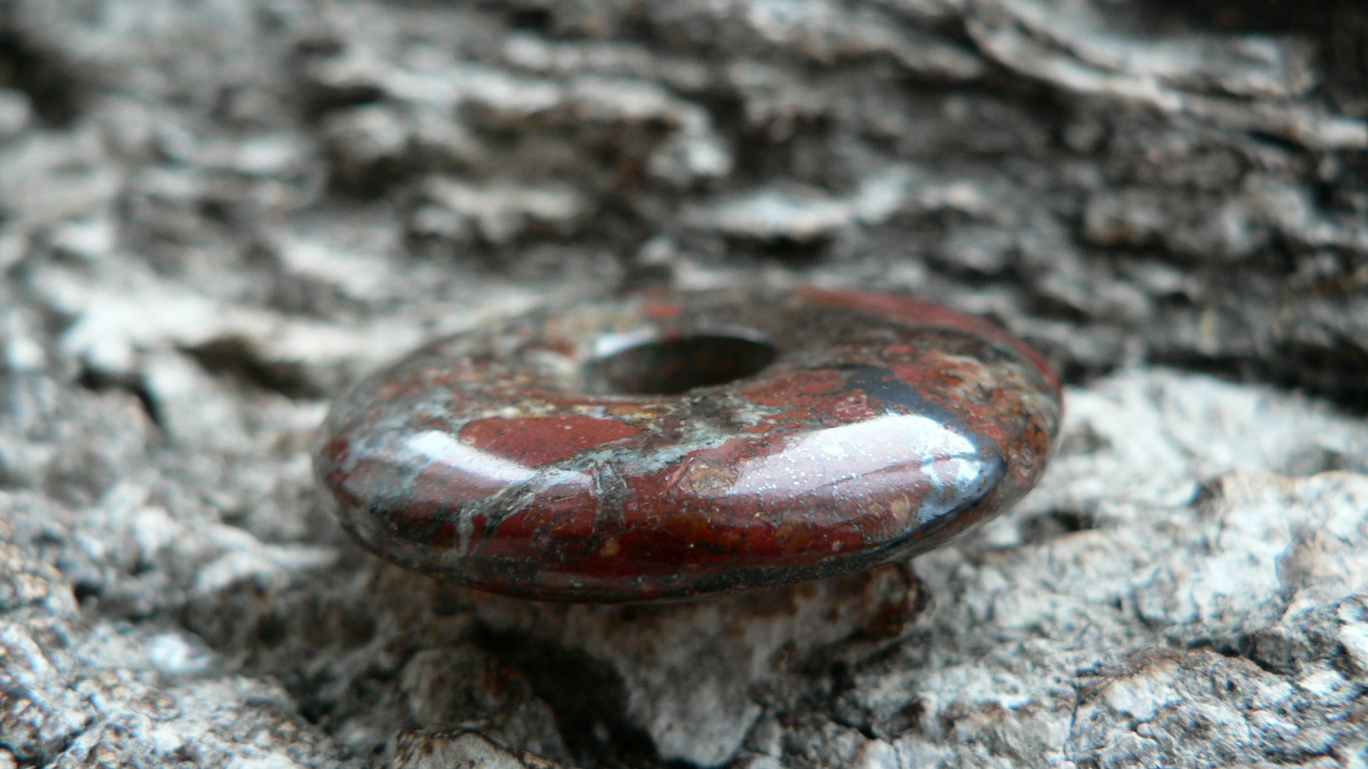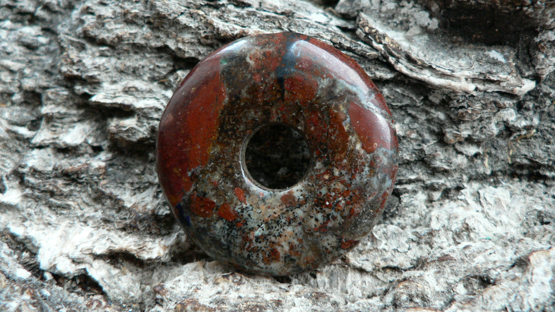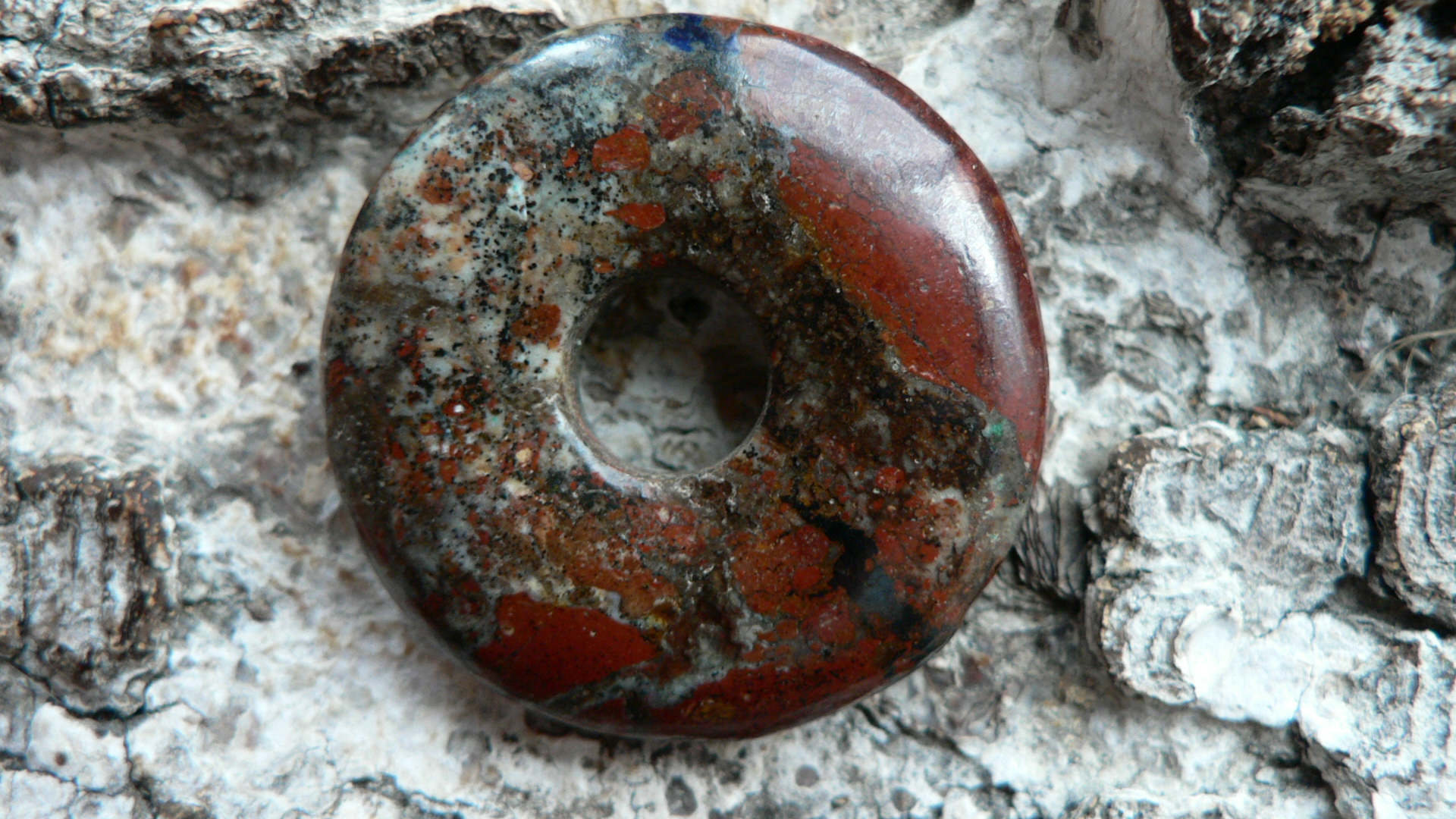 Dieser Donut ist etwas ganz besonderes.....er besteht aus Zarinit. Dieses Mineral gehört zu den Neufunden, da es erst 2015 in Russland (Oblast Kemerovo) entdeckt wurde. Es besteht hauptsächlich aus Cuprit (Kupfer) sowie Azurit, Chrysokoll und Malachit. Es wird mühevoll in derben Massen abgebaut. Eine Rarität, die eine wunderschöne Farbenwelt zeigt. Der gezeigte Donut ist ca. 35mm groß und besitzt die Farbe rot (Cuprit), blau (Azurit) sowie auch grüne Chrysokolleinflüsse. Wir liefern dieses Kleinod mit Lederband im Schmuckbeutel.