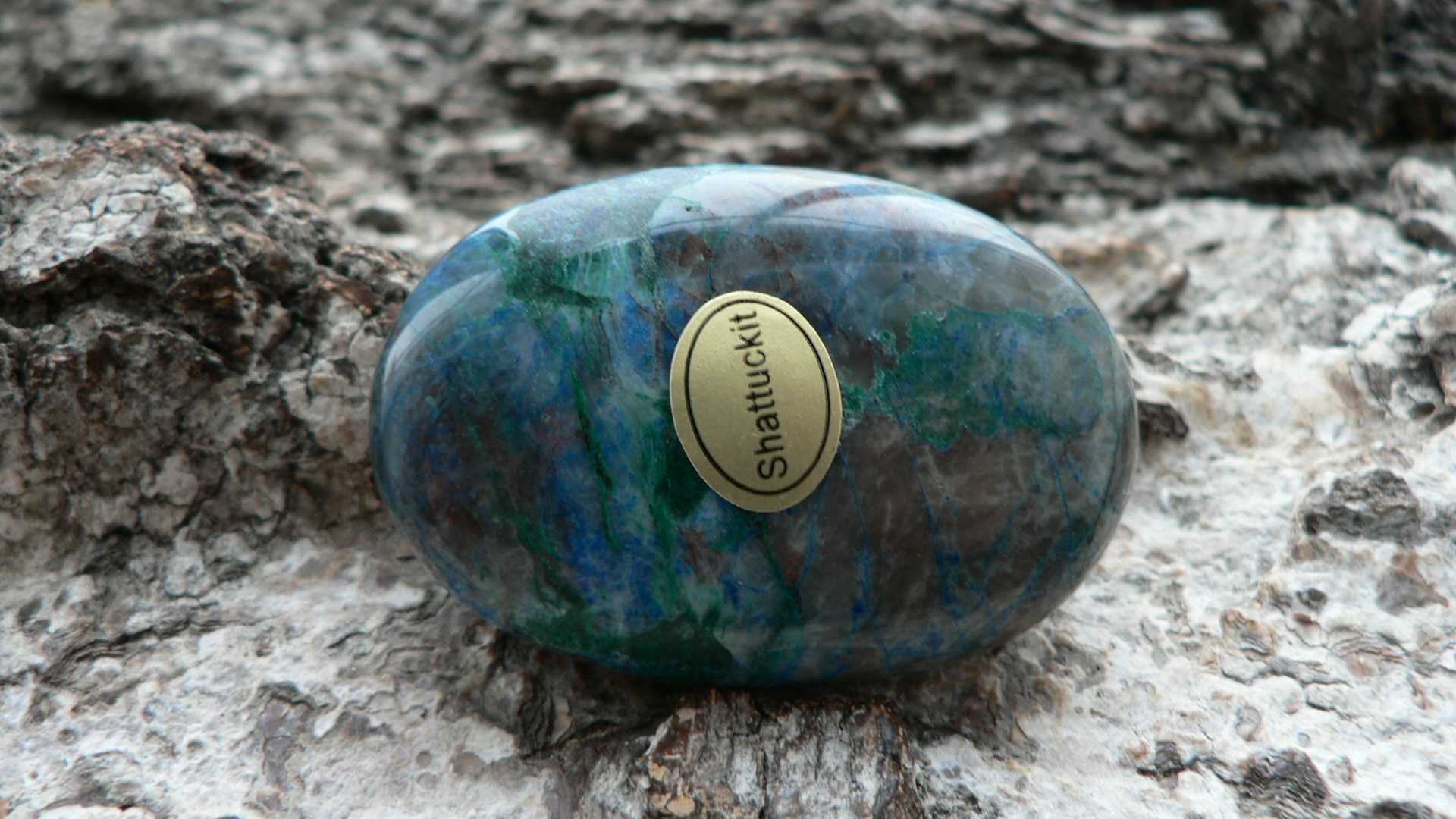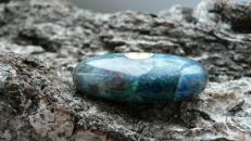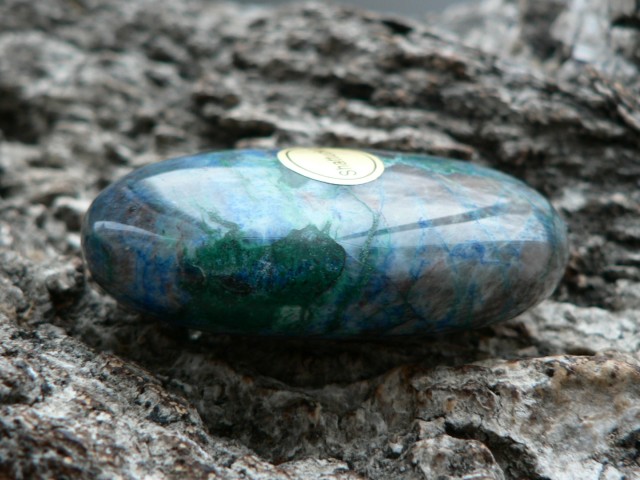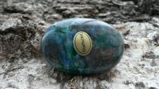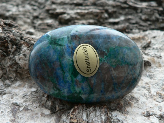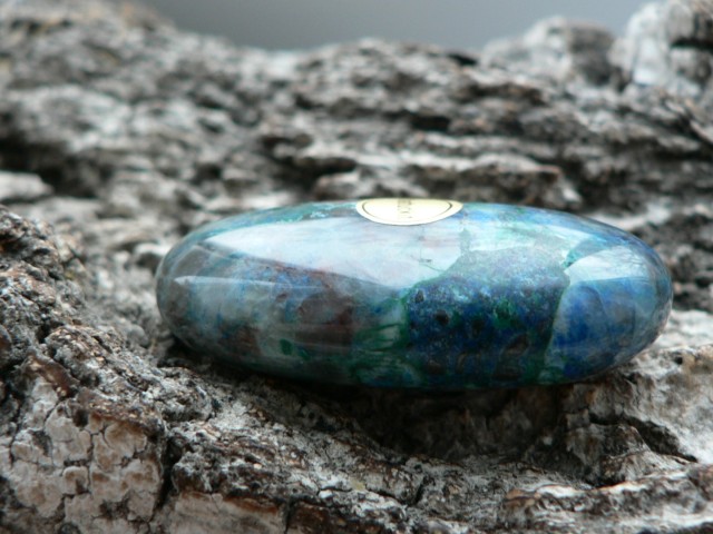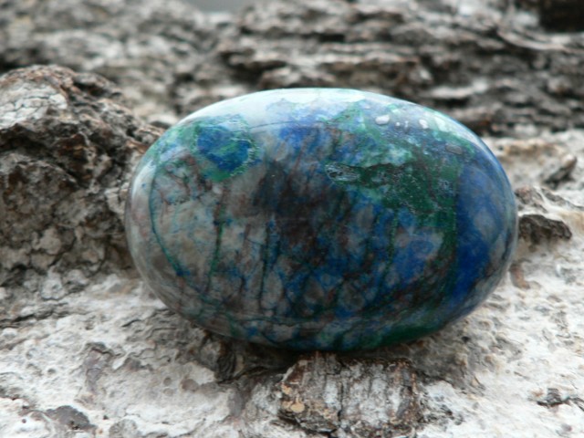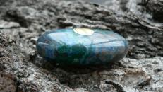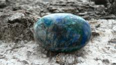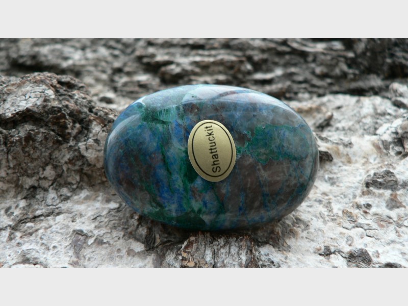 Dieses Unikat ist ein sogenannter Linsenstein aus wunderschön gezeichnetem Shattukit. Auch Dioptas ist hier und da ersichtlich. Der Rohstein zu diesem stammt aus Namibia. Der prachtvolle Linsenstein ist ca. 4,5 auf 3 cm groß sowie 1,3 cm tief. Wir liefern diesen im Schmuckbeutel aus.