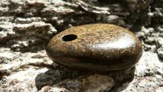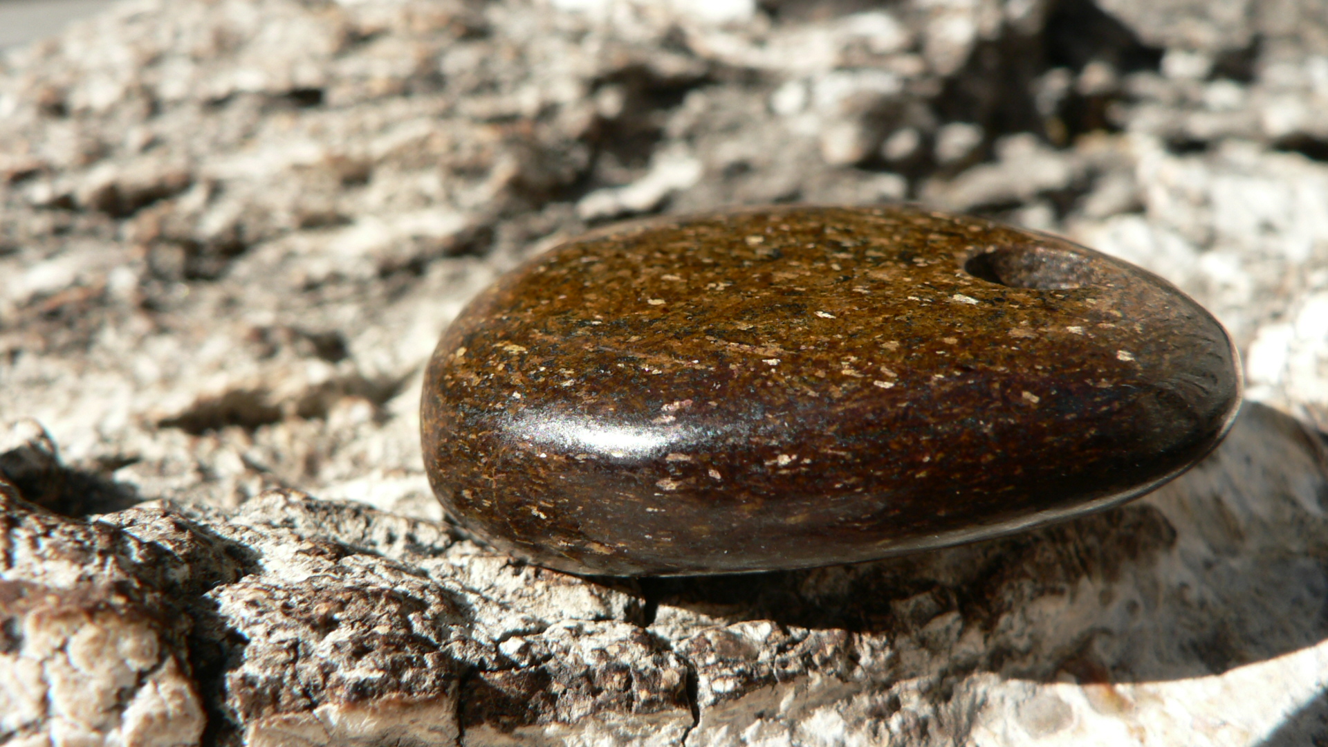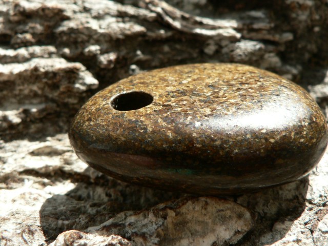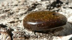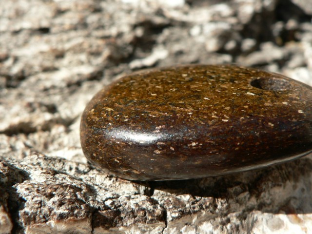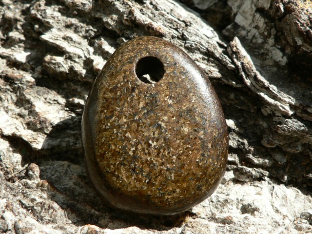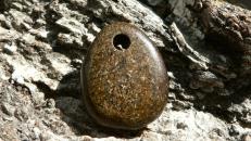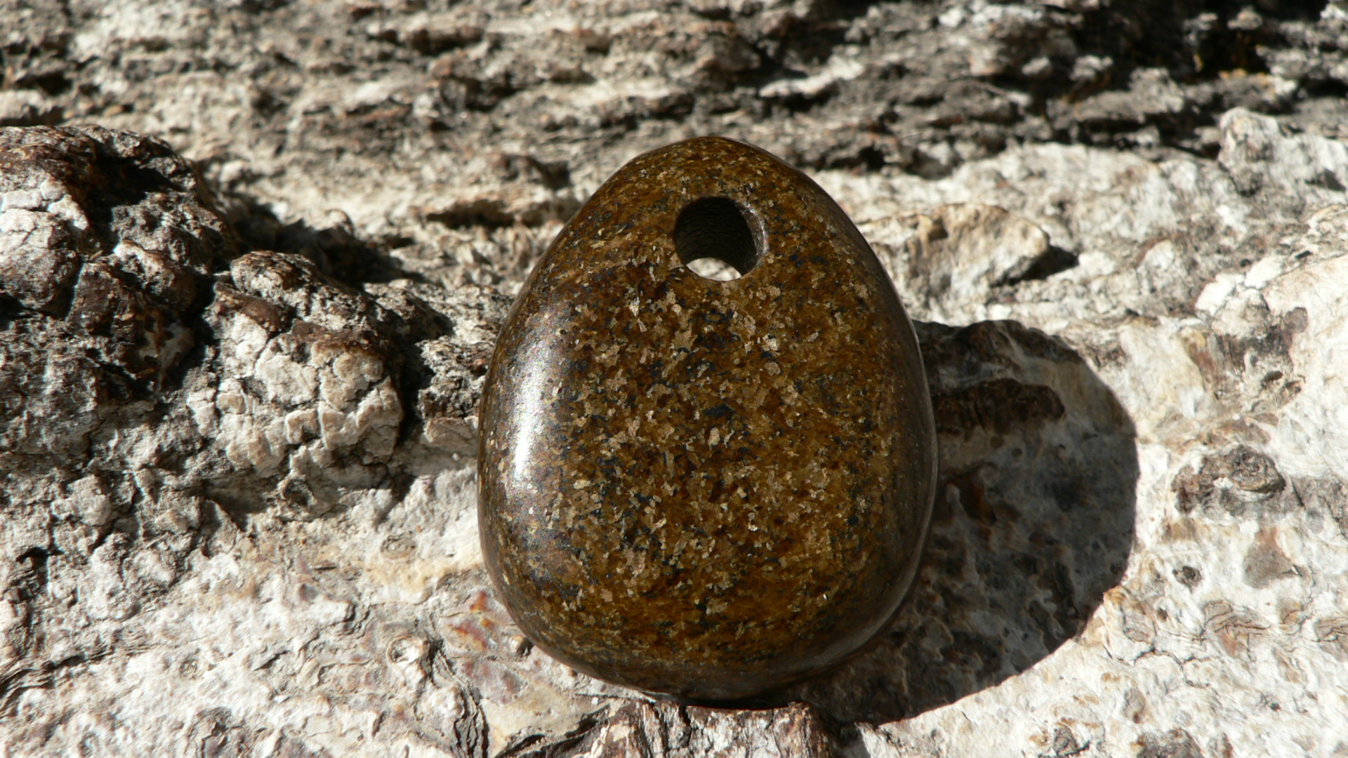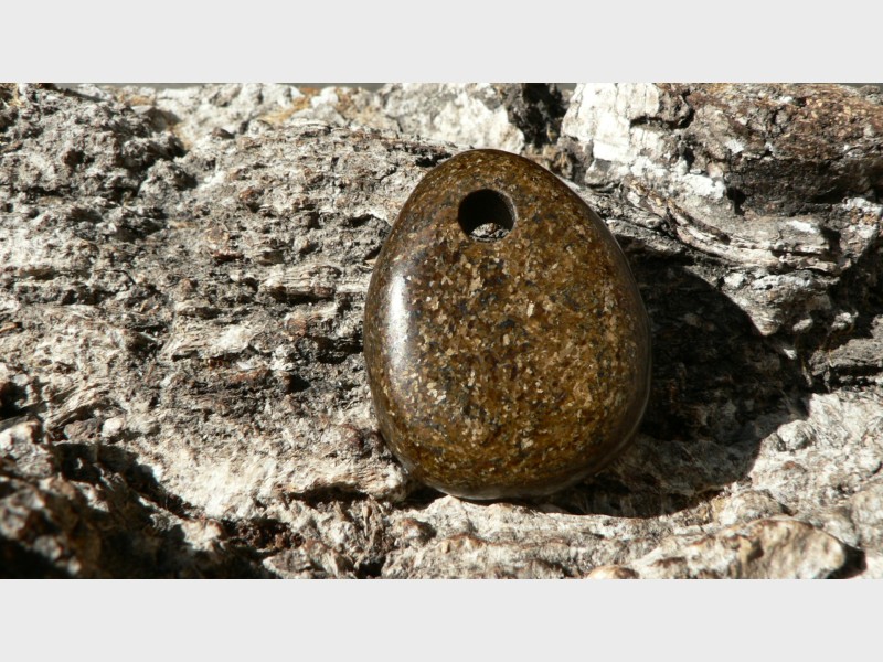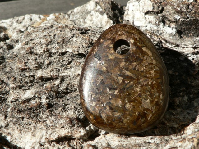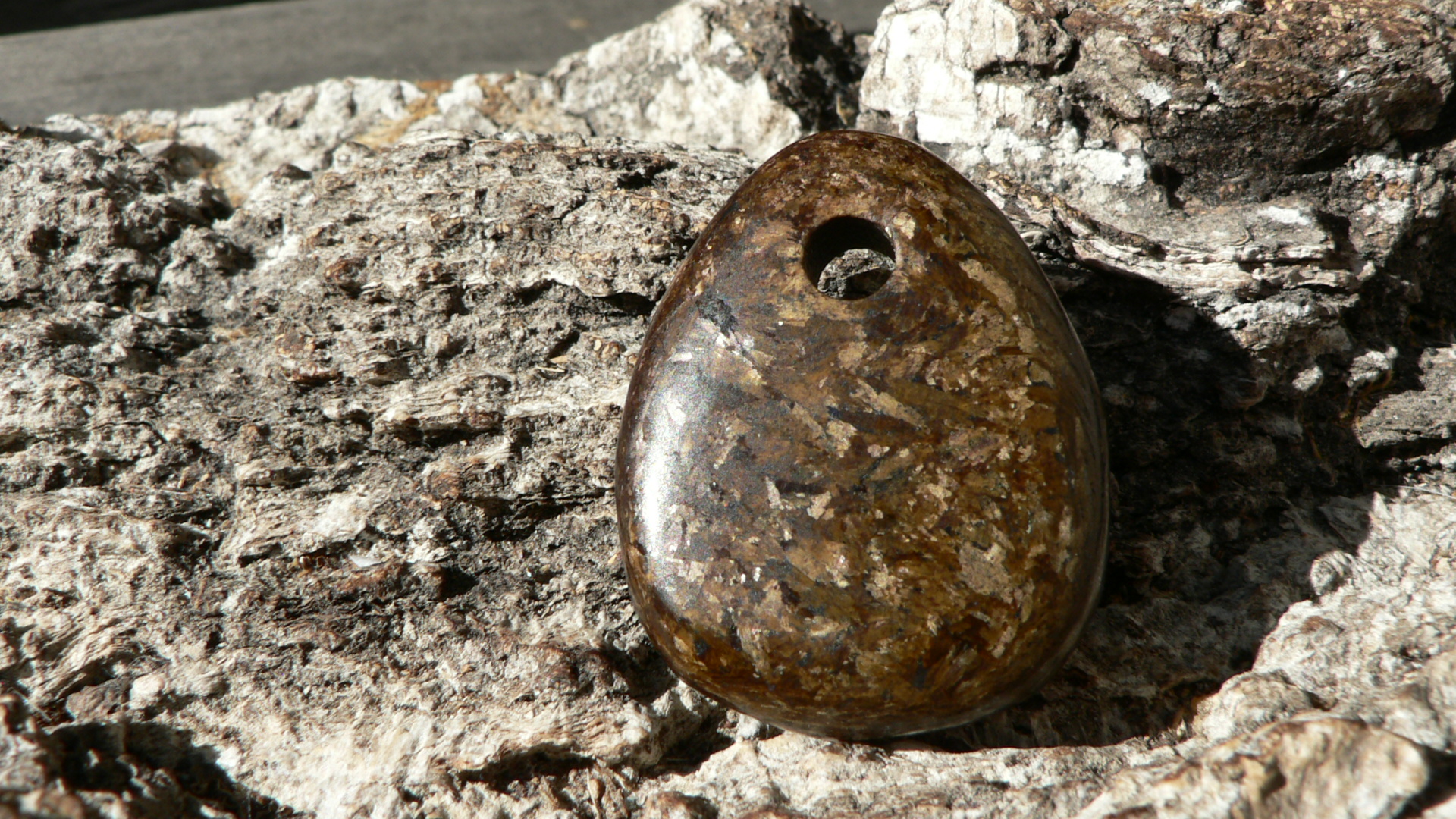 Dieser große, frtontal gebohrte Anhänger in flacher Tropfenform besteht aus beidseitig prachtvoll golden schimmernden Bronzit. Das schöne Unikat ist ca. 3 cm auf 2,7 cm groß sowie 0,8 cm tief.. Wir liefern den gezeigten Anhänger mit Lederband im Schmuckbeutel aus.