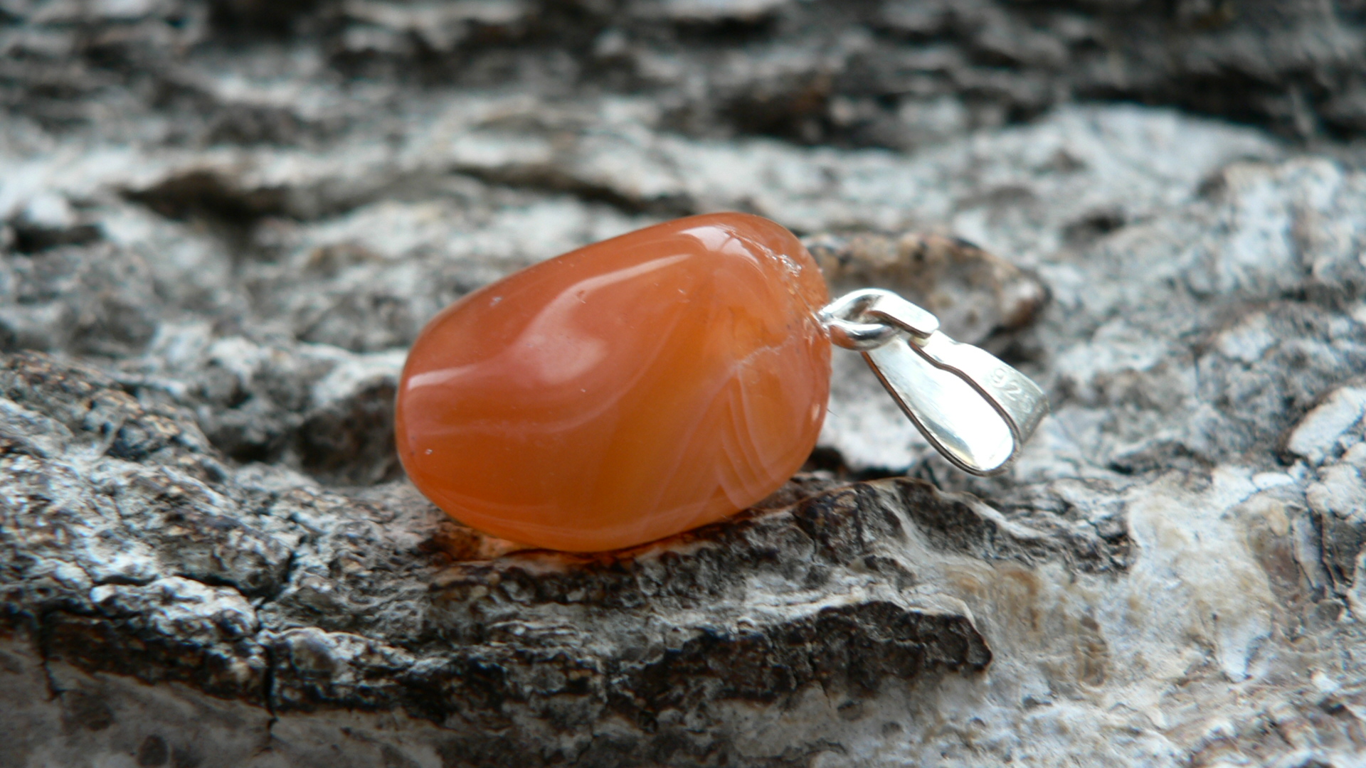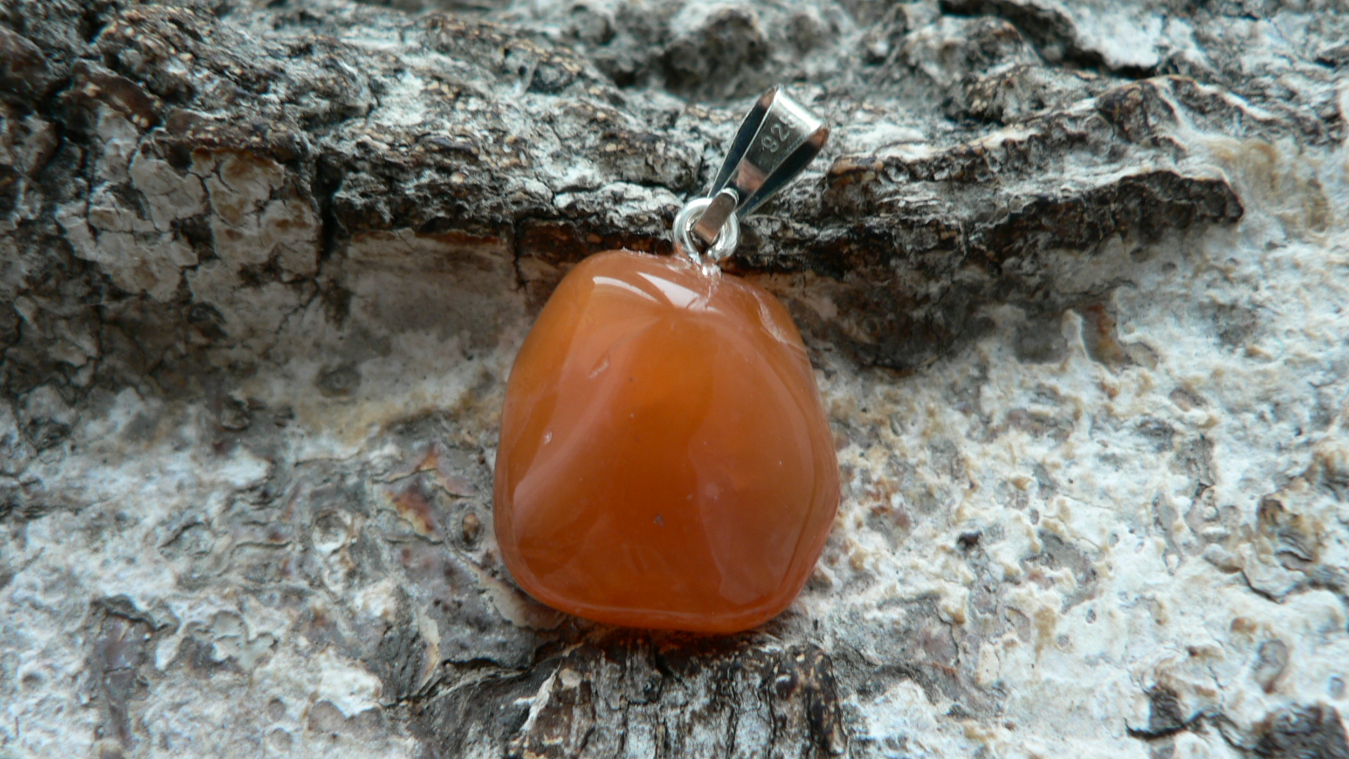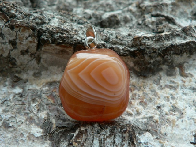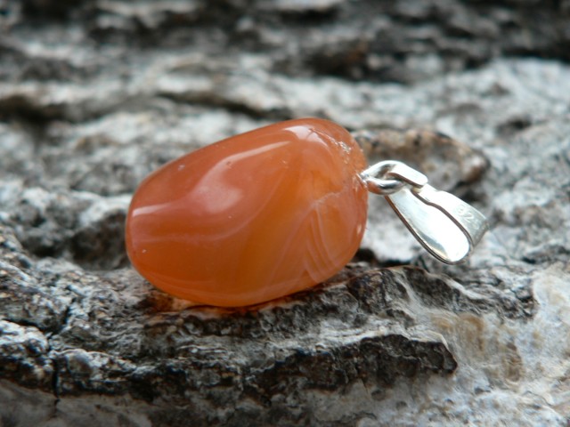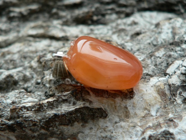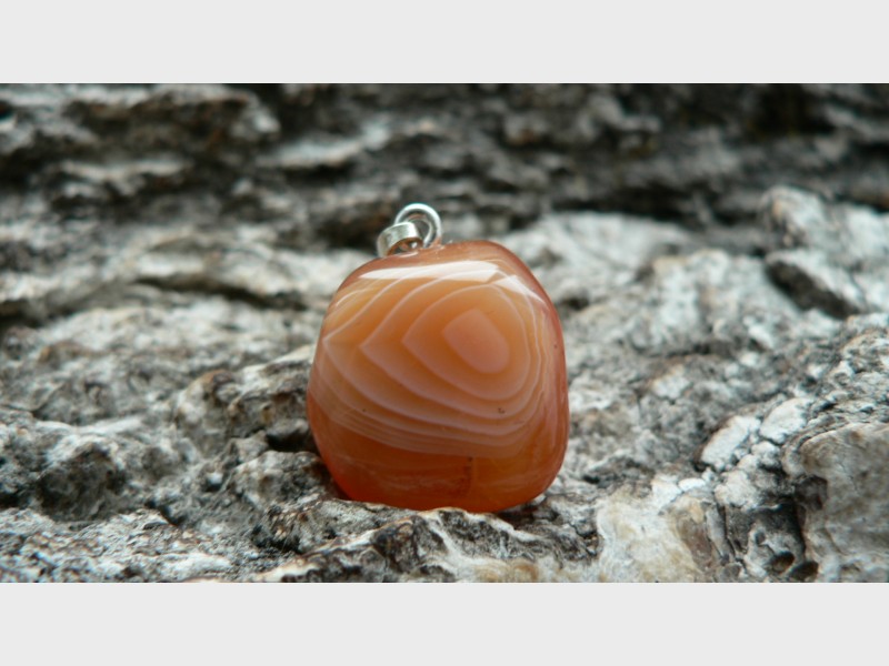 Der Karneol Rohstein für diesen Anhänger stammt aus Botswana und ist fair gehandelt worden. In Deutschland angekommen wurde der prachtvolle Karneol zu einem Freeformanhänger gearbeitet und mit einer 925er Silberöse versehen. Diese absolute Schönheit weiß zu entzücken mit seinem leuchtenden Orange sowie auf der einen Seite mit einer bildschönen Bänderung. Ohne diese gemessen, ist der Karneol ca. 1,8 auf 1,6 cm groß sowie 1 cm tief. Wir liefern das Unikat mit Lederband im Schmuckbeutel aus.