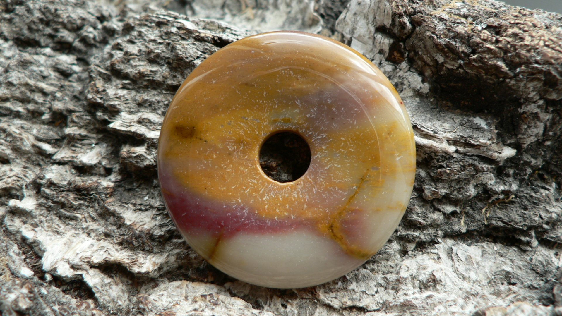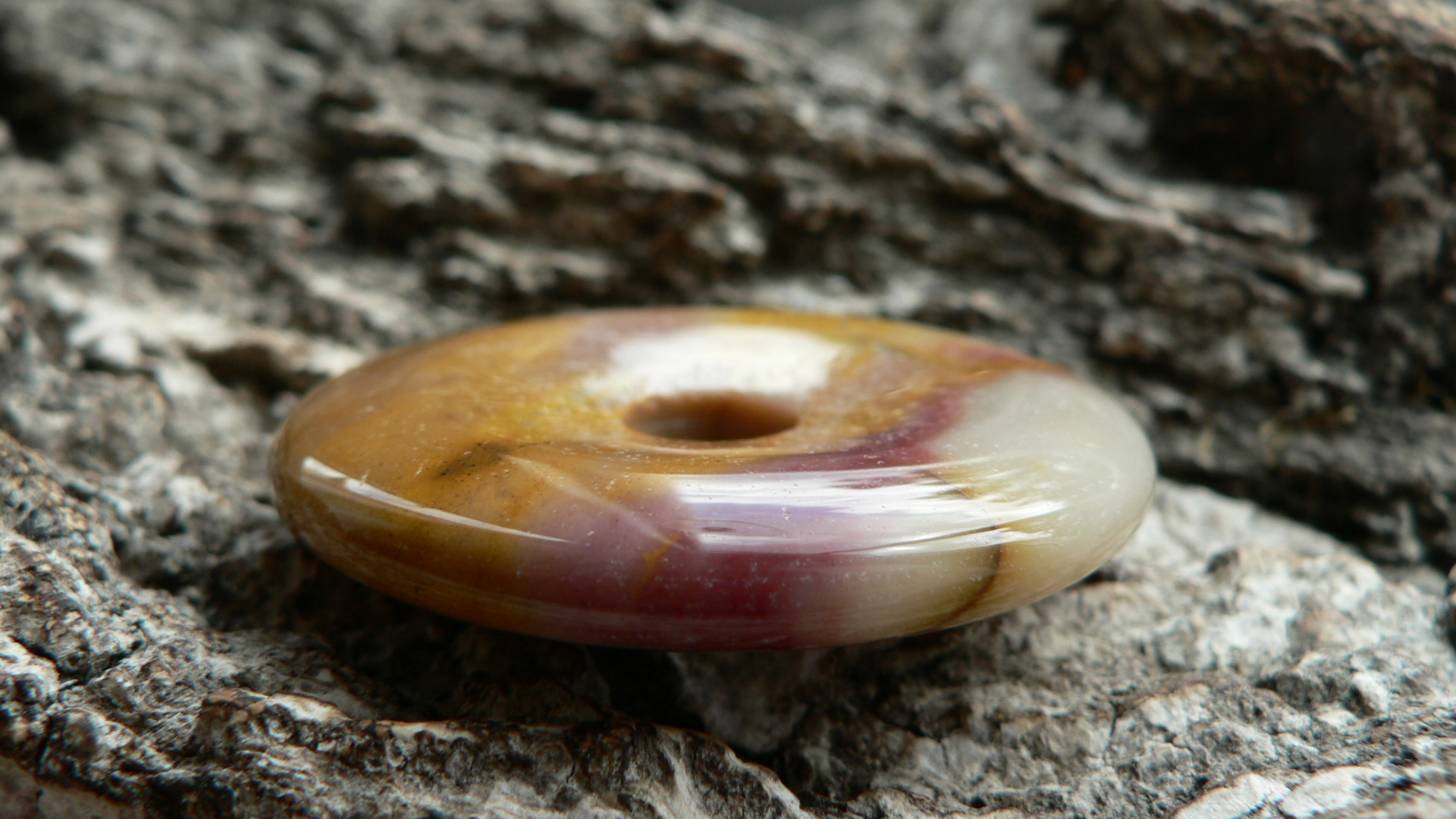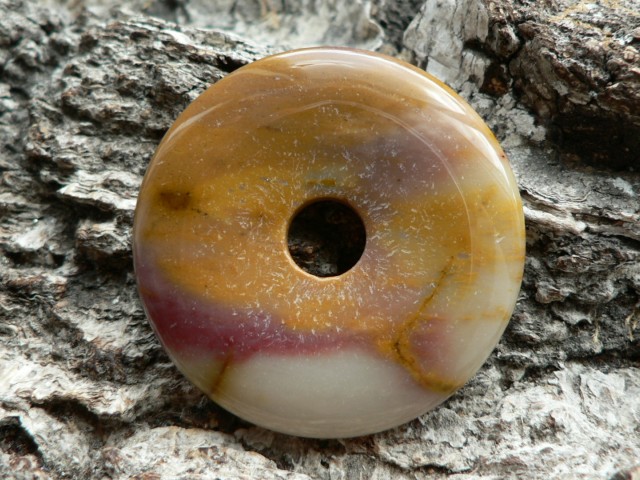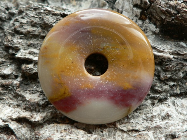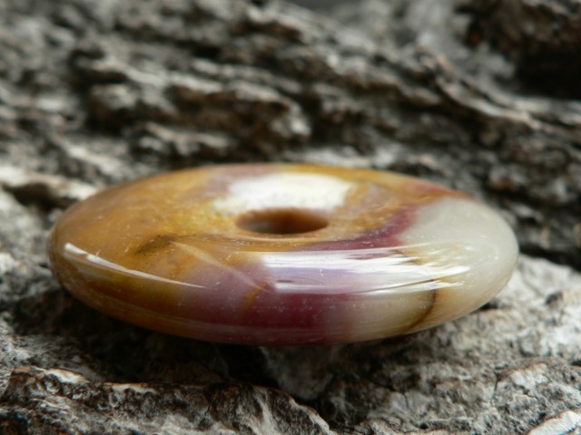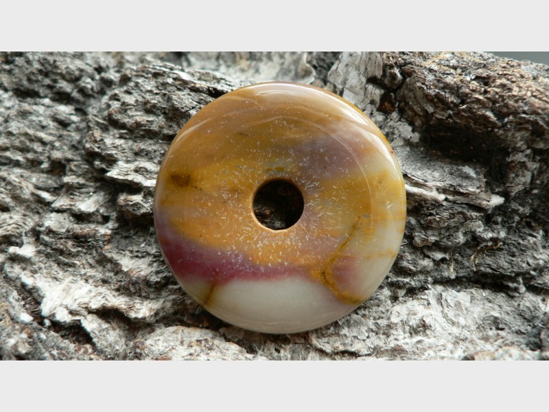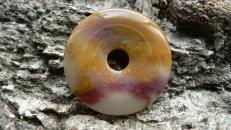 Dieser mehrfarbige Donaut besteht aus Mookait....seine Farben Orange, Rot, Rose auf Sandbeige wissen zu begeistern.